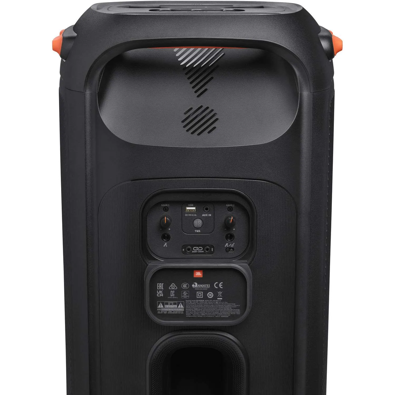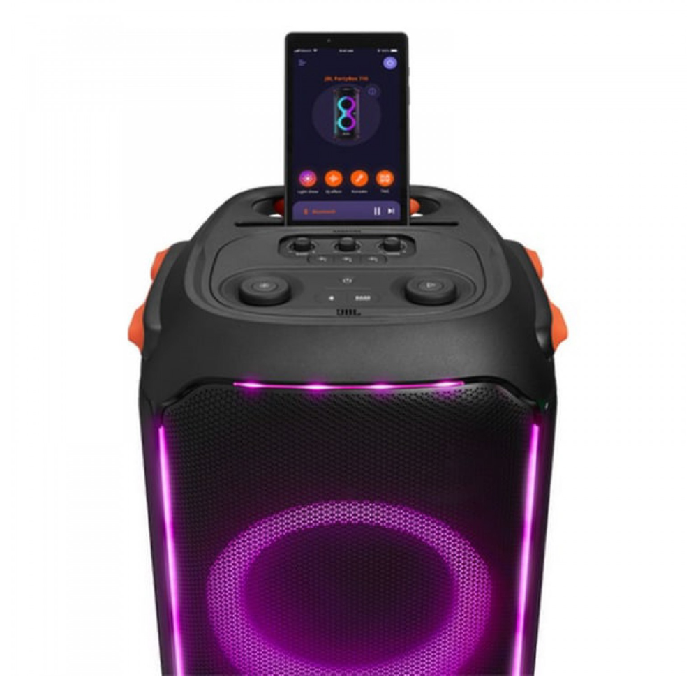 The splashproof PartyBox 710 transforms your next event into a real party, concert or nightclub. With its unique and colorful light show synced to JBL Original Pro Sound. Minimalistic and intuitive top panel controls and the PartyBox App let you create next-level musical and visual experiences. Customizing both the flashing, strobe lights and the amazing sound from the dual set of tweeters and bass-rich woofers. One-button True Wireless Sound instantly pairs two PartyBox 710s for an even bigger crowd. And with an easy-to-grip handle and robust wheels, you can keep the good times rolling wherever the party goes.